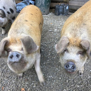 Thelma is a confident pig, like her sister. They are very similar in appearance, but Thelma has a shorter snout and more black spots on her back. They are a devoted family and the three of them are usually together.